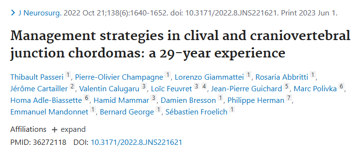 发表于《Journal of Neurosurgery》(神经外科杂志)上的论文《Management strategies in clival and craniovertebral junction chordomas: a 29-year experience》