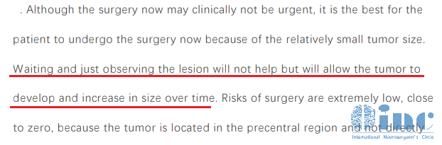 巴教授评估结果:这是一个右侧矢状窦旁额上回内的低级别胶质瘤。建议尽快进行手术。虽然手术临床上不是紧急性的,但由于肿瘤相对小,现在接受手术对病人来说是较好的。等待和观察病变不会有任何帮助,而让许肿瘤随着时间的推移继续生长和增大。手术风险低,接近于零,切除率会达到99-全切。
