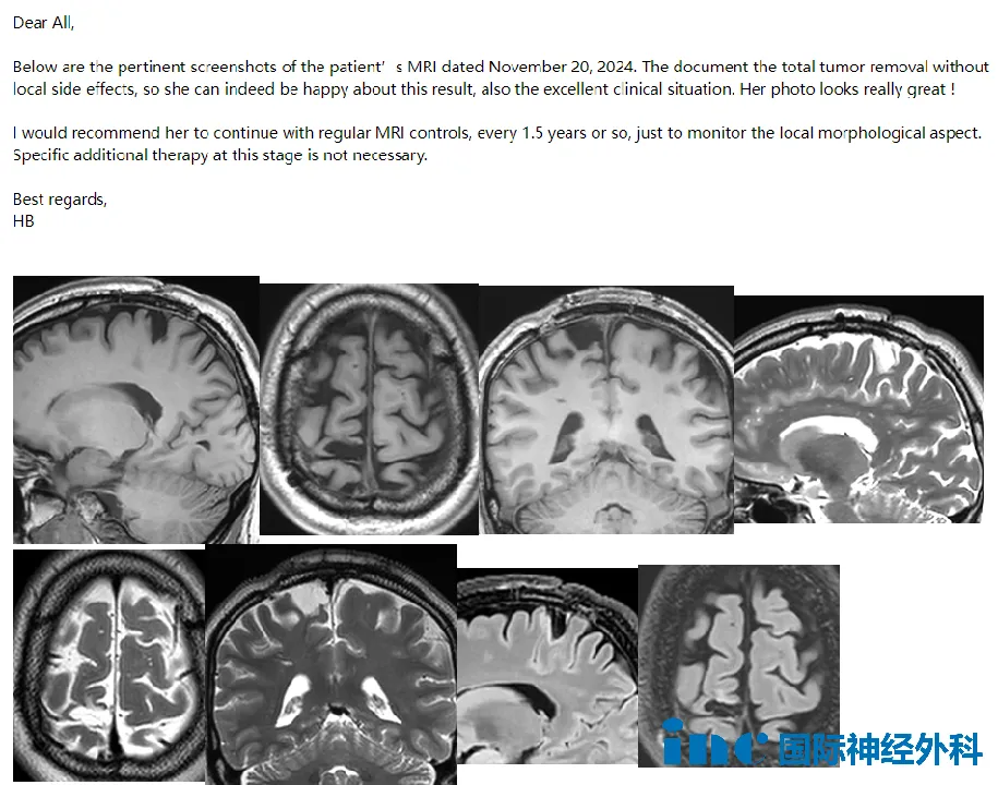“肿瘤得到全切,没有局部副作用,这确实是一个值得高兴的临床结果,她的状态看起来也非常好。此外,她的照片也展现出了极佳的精神面貌!我建议她继续每1.5年左右进行一次常规的核磁共振检查。目前,她无需接受任何特殊的额外治疗。”