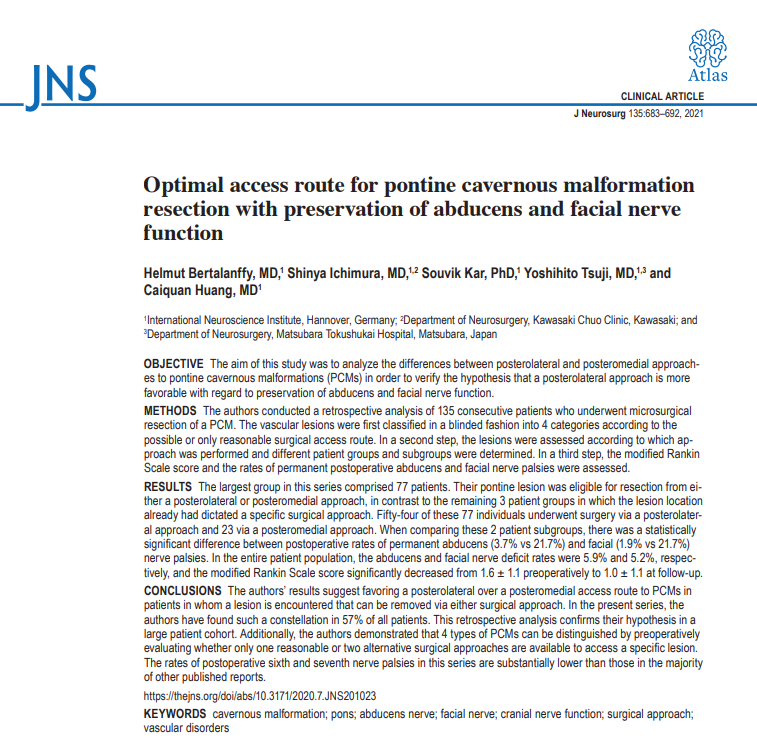JNS发表德国巴特朗菲教授135例脑干脑桥海绵状血管瘤手术入路及疗效研究