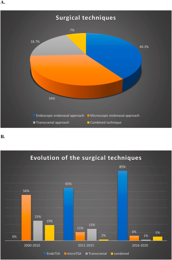 巨大垂体神经内分泌肿瘤的外科治疗:代表EANS颅底部门的荟萃分析和共识声明——图A:在1229例患者中,495例(40.3%)采用了内镜经鼻入路(EEA),418例采用了显微镜下经鼻蝶入路(34%),230例采用了经颅入路(18.7%),86例采用了联合入路(鼻内和经颅联合入路,7%)。图B:总结了不同时期不同技术的时间演变。