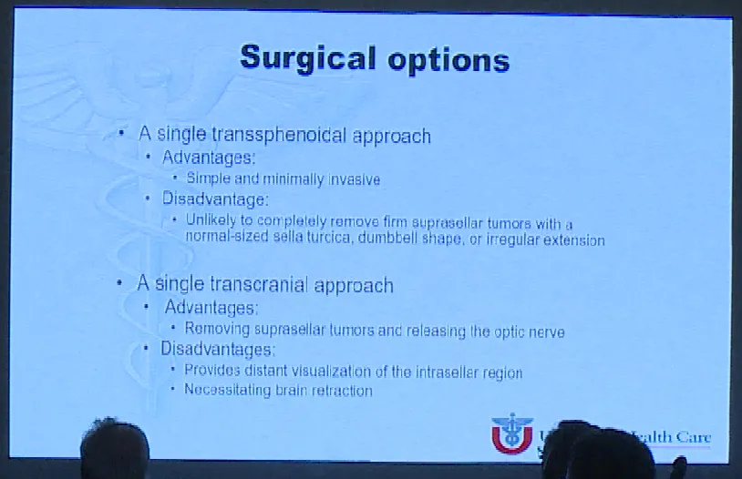 优势在于手术的视野大,对病灶充分暴露,操作空间相比经蝶入路的手术方式大,对于保护颅底的各个重要结构有很大意义,移除鞍上神经释放视神经;缺点在于鞍内区域的远距离可视化;需要大脑收缩。