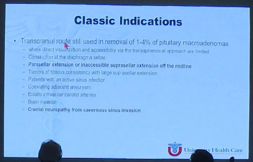 经颅途径仍用于切除1-4%的垂体大腺瘤;经蝶入路的直接可视化和可接近性受到限制;鞍膈肌收缩;鞍旁延伸或不可触及的鞍上延伸远离中线纤维致密性肿瘤伴大鞍上延伸;活动性鼻窦感染邻近动脉瘤的患者;扩张的鞍内颈动脉;脑部侵犯;海绵窦侵犯引起的病变。