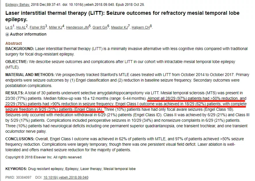 2018年,美国斯坦福癫痫综合治疗中心团队在《Epilepsy Behavior》发表了LITT较新临床治疗效果报告。