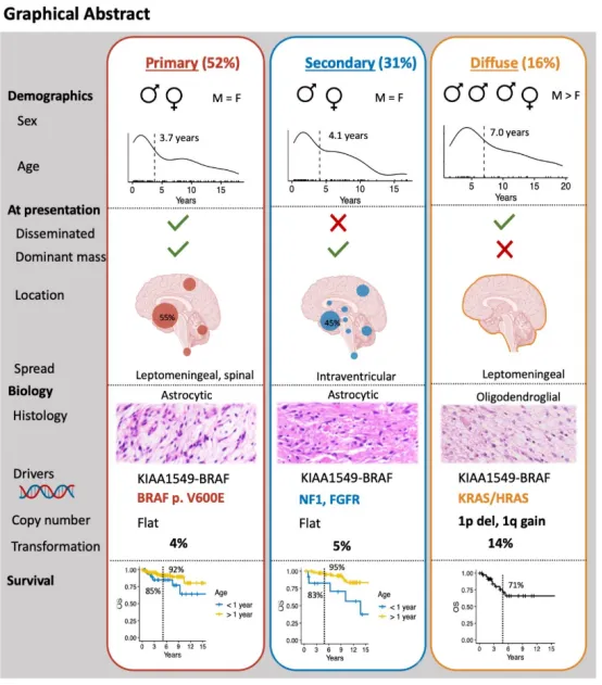 根据弥漫扩散的时间和空间分布,Rutka教授将患者分为三个亚组。其中,无原发肿瘤的弥漫性脑膜下肿瘤以及发生在婴儿期的肿瘤预后最差。其基因特征与未弥漫扩散的低级别胶质瘤高度重叠,这说明非遗传机制在肿瘤弥漫扩散中起到重要作用。
