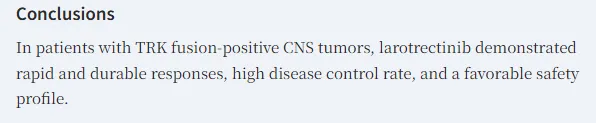 尽管目前还没有针对CDKN2A/B突变的药物,不过,确实有一些药物是针对NTRK突变的,包括Larotrectinib(Vitrakvi)、Entrectinib(Rozlytrek)和Repotrectinib(Augtyro)。其中Larotrectinib已在多项研究中被证实,对于具有TRK融合变异的患儿来说有着良好的控制率和安全性。