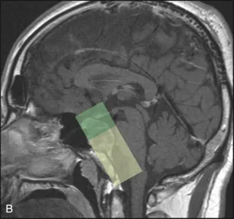 图26.1:斜坡脊索瘤的手术轨迹。(A)内镜经鼻入路手术走廊示意图。经蝶窦入路(绿色)暴露颅底中心的鞍、鞍上和鞍旁区域。经颅内窥镜鼻内入路(黄色)是通过切除下斜坡获得的,在中线提供通往脑干的通路。(B) t1加权磁共振中线矢状面显示经蝶窦入路(上,绿色)和经颅入路(下,黄色)暴露的区域。(C)两名外科医生在内镜经鼻入路中一起工作;在切除肿瘤的过程中,内镜、钻孔和吸痰总是可见的。