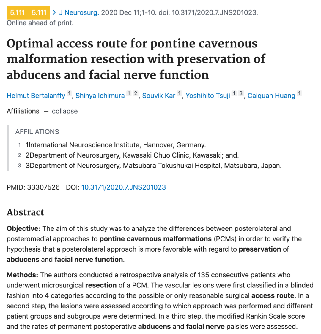 研究表明:对于有手术切除适应症的患者,更倾向于脑桥后外侧入路而不是脑桥后内侧入路切除,这项回顾性分析证实了他们在大型患者队列中的假设。此外证明,通过术前评估是否只有一种合理的或两种替代手术方法可用于进入特定病变,可以区分4种类型的脑桥海绵状血管瘤,该系列手术术后外展及面神经麻痹的发生率大大低于大多数其他已发表报导中的发生率。