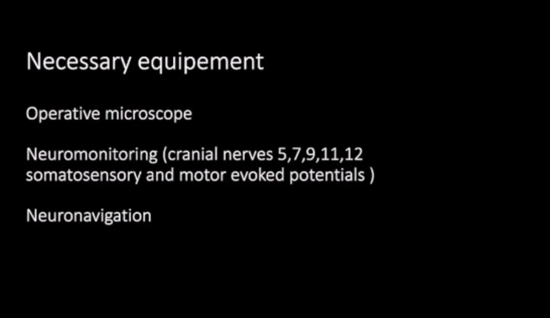必需设备:监测脑神经、体感诱发电位和运动诱发电位。使用神经导航来定位横窦-乙状窦交界处。