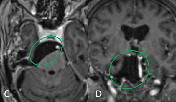 术后:C术后轴位及D冠状位T2加权磁共振成像(MRI)显示,肿瘤已实现大体切除,同时观察到神经血管结构得到有效减压。