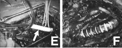 E&F:分流管通过血管假体(双直径5mm,长度6cm)(箭头),连接颈总动脉(CCA)和远端ICA,并用血管假体进行切除重建。