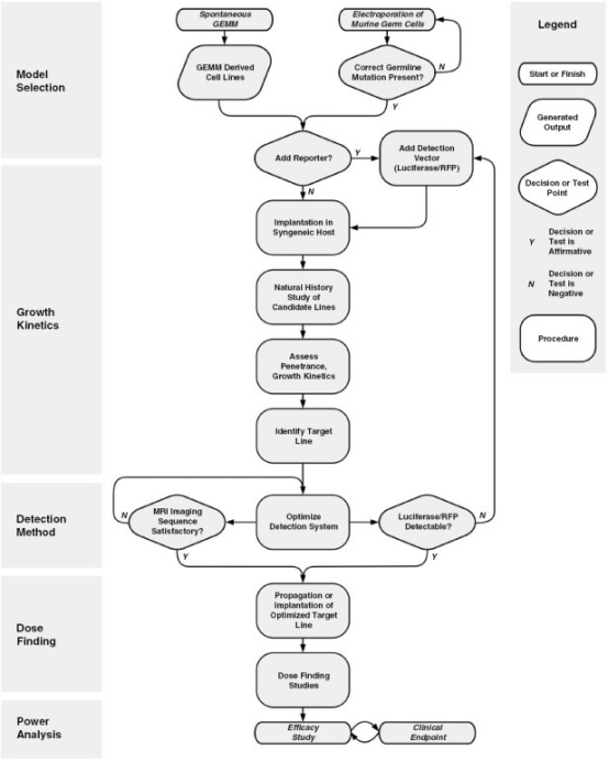 此外,研究还形成了临床前模型决策流程示意图。首先需要确认突变的存在。根据肿瘤细胞的生成方式,应考虑在同系宿主进行自然史研究前是否添加报告基因(如荧光素酶/RFP)。评估多代小鼠的肿瘤外显率和生长动力学对于建立可预测的模型以供后续研究至关重要。