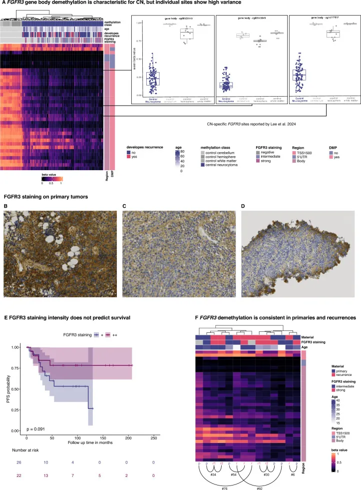 A对原发肿瘤及Capper等人2018年研究中对照组织的FGFR3基因座甲基化值进行聚类分析显示,基因体严重低甲基化是CN的显著特征。然而,个别FGFR3 CpG位点(特别是Lee等人2024年研究中指出的三个CN特异性位点)表现出高度变异。FGFR3甲基化水平与FGFR3染色强度无对应关系。