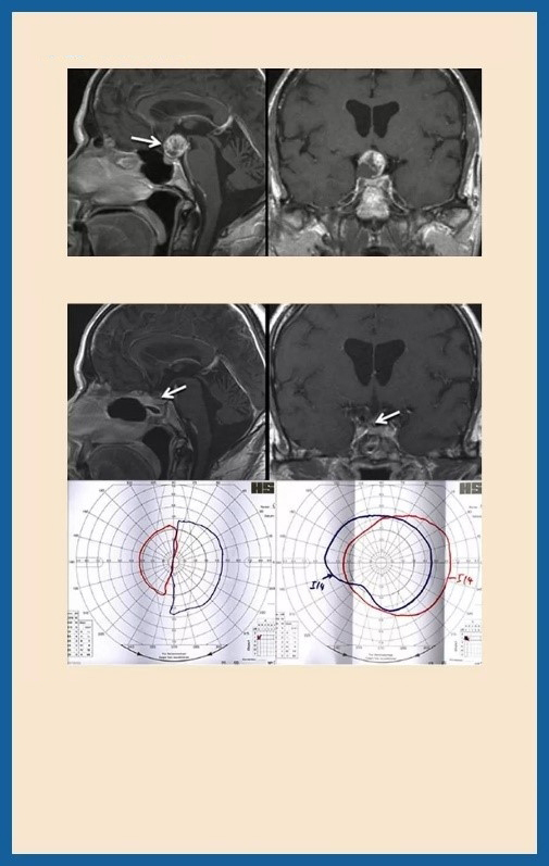 术后情况:术后14天视野确定已经显示出外部边界的明显好转。视力右侧为1.0,左侧为0.9。短期尿崩症也已完全消退。术后一年MRI显示完全肿瘤切除,保留垂体姿势和脑下垂体。手术后2年,没有复发性肿瘤。