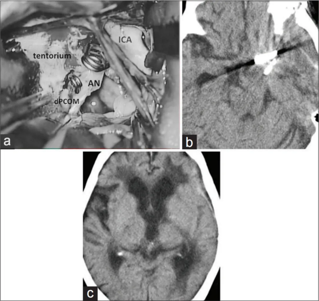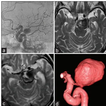 (a)确诊后4个月的血管造影显示,动脉瘤直径为12mm,起源于后交通动脉。