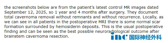 术后1年4个月的随访中,复查核磁给出了完美结果:病灶完全切除,无残留、无复发。按照建议,杜先生下一次MRI复查将安排在2026年底,此后每三年复查一次即可。他无需特殊限制生活方式,只需像普通人一样正常生活,不必再为曾经的脑桥海绵状血管瘤忧心。