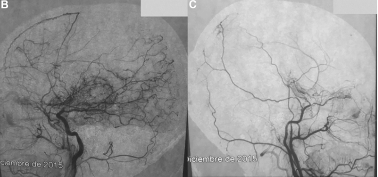 Hobart的双侧基底节呈“烟雾”络脉改变,右后交通动脉通畅,然而,并没有明显的侧支循环,尤其是来自右颈外动脉的侧支循环。此时他已经出现严重的语言障碍和偏瘫。