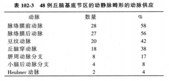 大部分丘脑基底节区的血管畸形有两条或更多的供血动脉。表102-3列出了48例AVM的供血动脉,在手术时经常发现丘脑穿动脉供应丘脑AVM的深面,但在术前的放射影像学检查中只发现18例(38%)。
