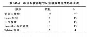 静脉引流位置深在,且靠近中线。 Soloman和 Stein报道了一例患者经正中裂向上矢状窦引流的病例,但我们研究的一系列病例表明,全部的丘脑,尾状核处的畸形血管都向深静脉系统引流。外囊部的病变向大脑中静脉系统引流。表102-4总结了48例动静脉畸形的引流静脉。3例向隔静脉和丘纹静脉引流的病例,导致室间孔阻塞,从而导致脑积水。脑积水已经被报道过,同样,中脑导水管阻塞也可以导致脑积水。