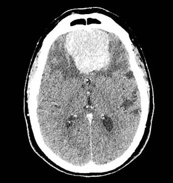 脑膜瘤是较常见的良性颅内肿瘤,占全部颅内肿瘤的三分之一以上,尸检时发现,2.3%的患者存在脑膜瘤。由于计算机断层扫描(CT)和核磁共振成像(MRI)利用增多,因此无症状脑膜瘤得以检出,估计多达2/5的脑膜瘤患者没有症状。下图的CT增强扫描显示一例77岁老年女性前颅底内前壁内均匀强化肿物。患者出现嗅觉丧失和进行性人格改变,包括其正常社会生活中的控制力丧失和兴趣下降。后对患者行简单的开颅手术,进行了肿瘤全切除;病理显示病变为国际卫生组织(WHO)分级I级脑膜瘤。