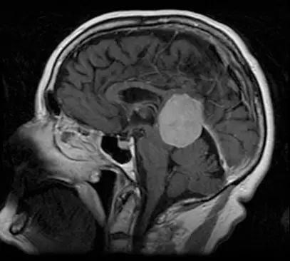 虽然脑膜瘤常为偶然发现,但大多数可通过临床症状鉴别。脑膜瘤起源于蛛网膜,而蛛网膜覆盖了整个神经轴。因此,尽管大多数病变于颅内发现,病变也可发生在整个神经系统。实际上,90%脑膜瘤位于幕上,其余发生在后颅窝或脊髓。脑膜瘤有几种常见的发生部位(尽管仅发生于脑室系统很少见),临床表现可随特定部位而变化。下图为增强MRI扫描T1加权像,显示松果体区脑膜瘤,可以看到附着于小脑幕的硬脑膜。