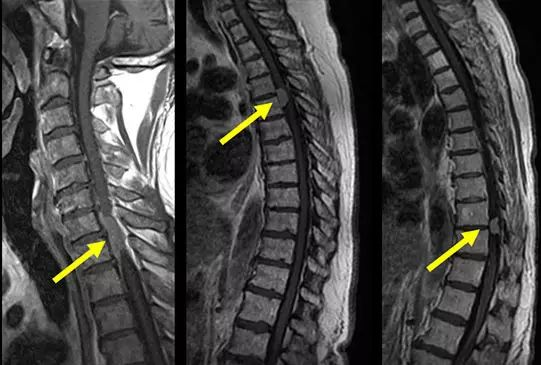 虽然脑膜瘤可发生在脊髓全部水平,但约80%位于胸段。这些脑膜瘤常表现出脊髓病的症状和体征,如渐进式步态和感觉障碍,并伴有上运动神经元病变表现。鉴别诊断应该包括神经鞘瘤、神经纤维瘤和转移瘤。下图显示的是三例不同患者的增强MRI扫描T1WI矢状位图像。从左至右,脑膜瘤分别位于C7-T1,T5-6和T10-11。影像学特点可以帮助鉴别神经鞘瘤与脑膜瘤;神经鞘瘤很少位于脊髓后,常常伴有神经孔扩大。脑膜瘤更有可能出现明显的硬脑膜附着。