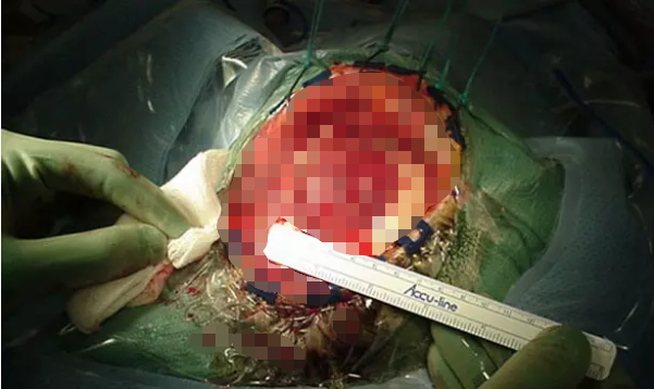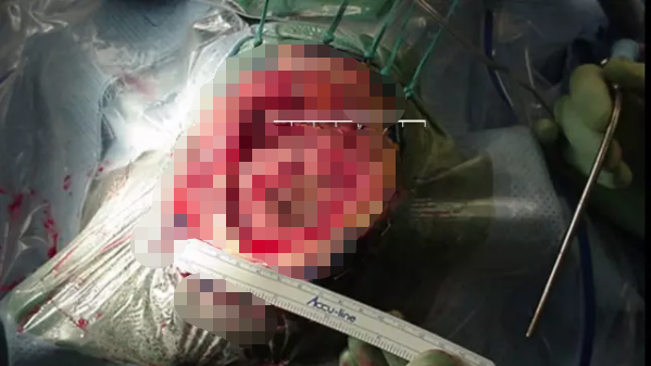 下图为前片所示同一患者的术中照片,可见颅骨被穿透,证实脑膜瘤骨浸润。头皮如前所述。患者的骨头尚未被剔除。