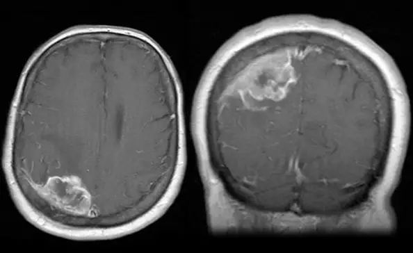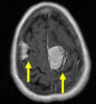 辐射诱发的脑膜瘤,通常源于低剂量辐射导致的头皮癣或高剂量辐射导致的血液或头颈部癌症,其往往为高分级、多灶性病变。从接受辐射到肿瘤发生之间存在几十年的潜伏期。下图为一例38岁的女性患者的MRI图像,她在头颅局部放射治疗急性淋巴细胞白血病后32年发病。轴位单层面图像显示了三个脑膜瘤中的两个。较大病变附着到大脑镰——一种将大脑分为左右半球的硬脑膜结构,较小肿瘤则沿右额叶凸出生长。大脑镰旁脑膜瘤和凸面脑膜瘤占全部脑膜瘤的近一半。