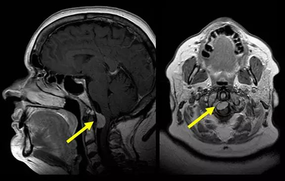 发生在颅颈交界部的脑膜瘤(MRI扫描,矢状位[左]和轴位[右])称为枕骨大孔脑膜瘤。枕骨大孔区肿瘤的经典表现包括肢体无力、感觉改变,无力症状开始于同侧臂,然后进展到同侧腿,之后是对侧腿,对侧臂。检查发现,患者触觉正常,但病灶对侧痛觉和温度觉缺失。往往上肢位置和振动感觉缺失比下肢严重。