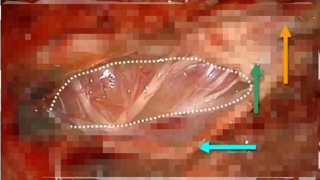 术中照片证实脑膜瘤位于颈髓连接处,正如MRI扫描所见。白色虚线提示肿瘤位置,蓝色箭头指向硬脑膜,绿色箭头表明副神经(脑神经XI)的神经根,橙色箭头指向颈脊髓上部。广泛全切除后恢复良好。病理示肿瘤为WHO I级脑膜瘤。