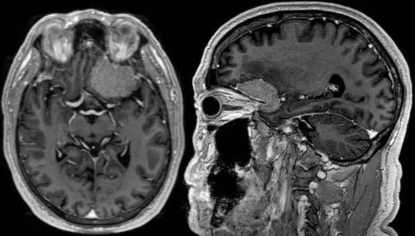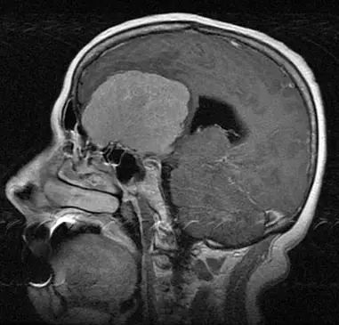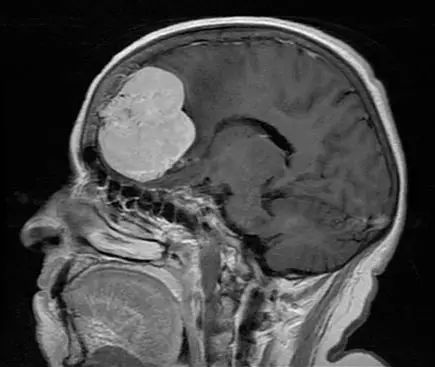 嗅神经沟是脑膜瘤三常见的颅内位置。嗅神经沟脑膜瘤(矢状位MRI扫描所见)的典型表现包括嗅觉丧失(失嗅症),其次是视力丧失和额叶功能障碍,还有典型的个性变化、兴趣和动力丧失(意志力丧失)和控制力下降。