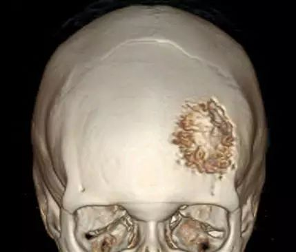 大多数脑膜瘤生长相对缓慢,具有良性肿瘤特征。国际卫生组织(WHO)将脑膜瘤分为三级。WHO I级脑膜瘤的复发风险相对较低,而更高等级脑膜瘤复发和侵袭性行为的可能性更高。WHO II级脑膜瘤为脊索状、透明细胞及非典型性病变,WHO III级脑膜瘤包括乳头状、横纹肌样和间变性肿瘤。WHO I级脑膜瘤是较常见的肿瘤,此类至少有九个亚型,较常见的是脑膜性、纤维性和过渡性脑膜瘤。下图显示的是一名61岁女性,头皮有一增大的肿块,CT扫描三维重建显示左额叶脑膜瘤累及骨质。这种影像学表现多提示肿瘤为一种侵袭性亚型。