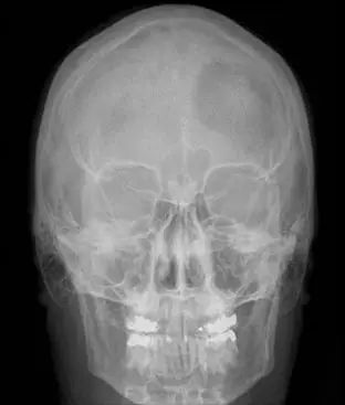 患者前后位X线片显示左额叶透亮,表明该处脑膜瘤已经侵入骨质。(X线颅骨像很少作为初始诊断检查,其鉴别诊断范围相当广泛,包括骨肿瘤。)
