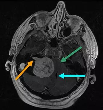 桥小脑角区脑膜瘤占全部脑膜瘤的5%~10%。这些病变需与前庭神经鞘瘤和转移瘤区别开来;影像学特点有助于鉴别诊断。下图为增强MRI扫描T1加权像,显示了经典的前庭神经鞘瘤,表现为“冰淇淋”征,呈圆柱形状,延伸至内耳道(橙色箭头)。神经鞘瘤缺乏脑膜瘤附近常见的硬脑膜增厚。脑干(绿色箭头)被肿瘤所扭曲,导致四脑室(蓝色箭头)受压,造成患者脑积水。此人表现为严重的共济失调与脑干和小脑功能障碍。