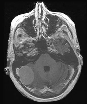 下图为MRI增强扫描,显示了位于内听道略后方的硬脑膜基底肿瘤。该肿瘤较大特点为不延伸至耳道,这提示它不是一种前庭神经鞘瘤;较可能的诊断是脑膜瘤。与之前的影像学相比,该病例局部占位较小,虽然这不是脑膜瘤和前庭神经鞘瘤之间的鉴别特征。