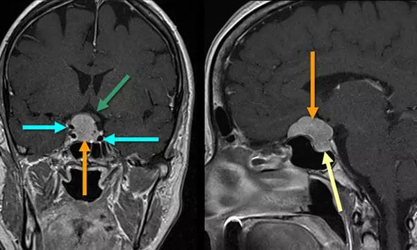 颅底脑膜瘤另一种常见的位置是鞍区。这个部位的脑膜瘤应与其他典型的鞍区肿瘤相鉴别,特别是垂体腺瘤。矢状位MRI扫描(右)表明,肿瘤的基底部位于鞍结节,这是鉴别这种病变与脑膜瘤的一个重要特征。冠状(左)和矢状图像中,橙色箭头指向肿瘤,使视交叉(绿色箭头)位置移动,并包围颈动脉。颈内动脉的流动空隙用蓝色箭头标注。将这种肿瘤诊断为脑膜瘤而不是垂体腺瘤的另一个因素是,垂体表现(矢状图像黄色箭头)与肿瘤截然不同。虽然传统治疗脑膜瘤和垂体腺瘤的手术方法常常涉及开颅手术,但现在这些病变可以通过鼻内镜途径进行,可使脑受到的牵拉减轻。