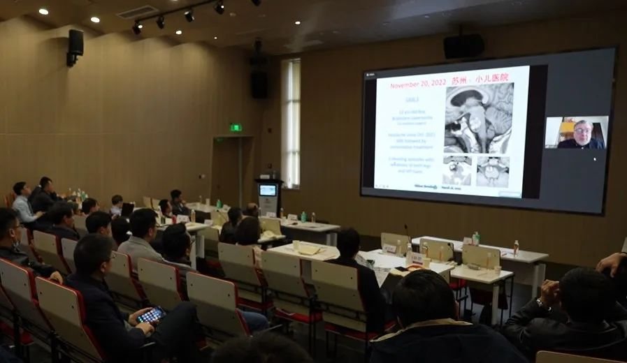 脑肿瘤的解剖与临床》与大家展开了探讨;苏州大学附属儿童医院(以下简称苏大儿童医院)神经外科王杭州教授则围绕《以穹窿为划分标识的中线深部脑肿瘤手术入路教学方法》以及《2022年度中德交流项目合作部分手术回顾——巴教授主刀五则案例》课题进行了交流。除了专题学术交流,会议还创新形式开设了壁报现场交流环节。与会学者在茶歇区进行典型案例交流,听众们可以边茶歇边自由提问探讨。这一形式大受欢迎,取得了好的现场效果。