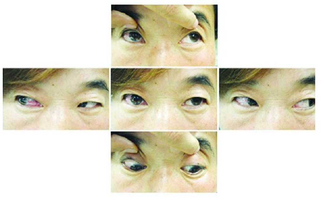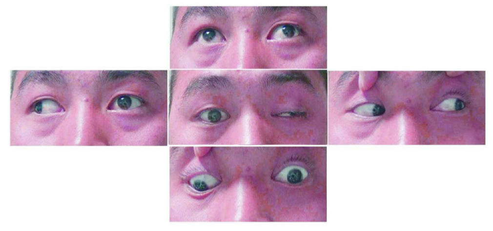 图1.Tolosa-Hunt综合征患者左侧额部疼痛、左眼睑下垂、复视来诊。眼位图示一眼位左上睑下垂,左眼球外斜位;左眼球内收、上转、下转均障碍,但外转正常;为左侧动眼神经麻痹。