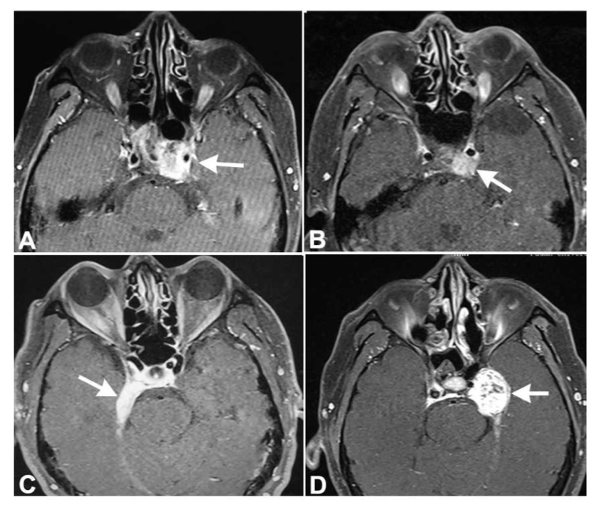 图3.海绵窦各种肿瘤病变MRI表现:(A):鼻咽癌患者左侧海绵窦转移(白箭)导致左侧外展麻痹;(B):甲状腺恶性肿瘤转移至左侧海绵窦(白箭);(C):左侧海绵窦脑膜瘤,导致患者慢性进行性右侧外展麻痹(白箭);(D):海绵窦三叉神经鞘瘤(白箭)。