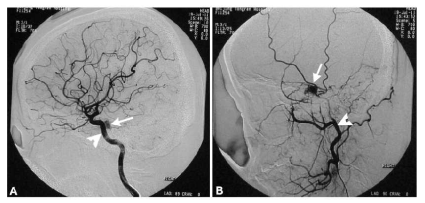 图6.患者脑血管DSA示:(A):海面窦段颈内动脉(白箭头)旁少量造影剂充盈(白箭);(B):颈外动脉与硬脑膜形成交通,造影剂异常渗漏(白箭),白箭头示正常颈内动脉。 (6)外伤性及医源性:外伤可导致海绵窦瘘及其他颅神经损害;蝶窦窥镜手术亦可造成损伤。