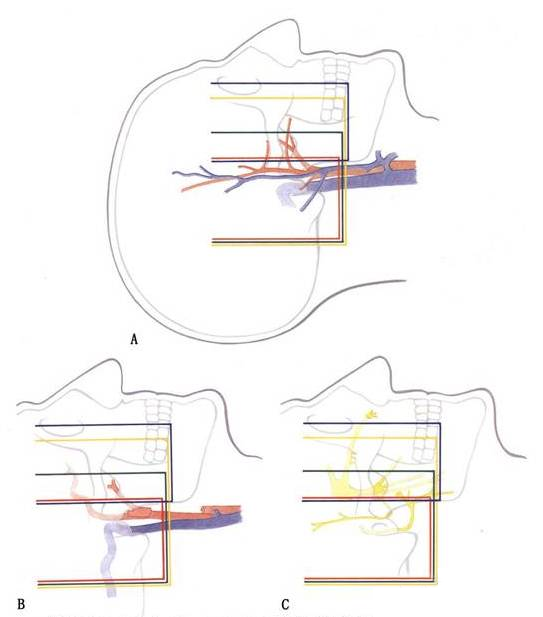 B型和C型颞下窝进路 B型和C型颞下窝进路,大部分步骤与A型手术基本相同。其不同点有:①切口更向前延伸。②切断颧弓连于嚼肌下翻转;③切去翼外肌和翼内肌上部;④切去髁突,磨去中颅底更多骨质、分离颞肌前下翻转等,使颈内动脉破裂孔等显露更充分。由于更向前下牵引下颌骨,面神经张力较大,往往须切断下支或全支切断面神经(术终时再吻合)。较后术野可以向前下显露至斜坡、鞍旁、鼻咽、翼腭裂等区域。