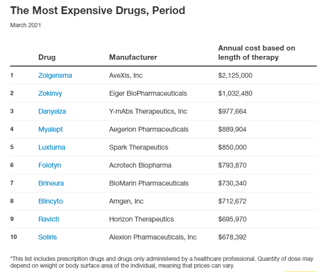 2021年较昂贵药物10