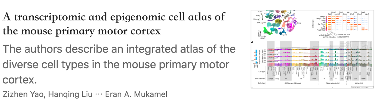 研究二:A transcriptomic and epigenomic cell atlas of the mouse primary motor cortex。构建小鼠初级运动皮层中超过50万个细胞的单细胞转录组和甲基化组,刻画出了超过56种神经元类型。
