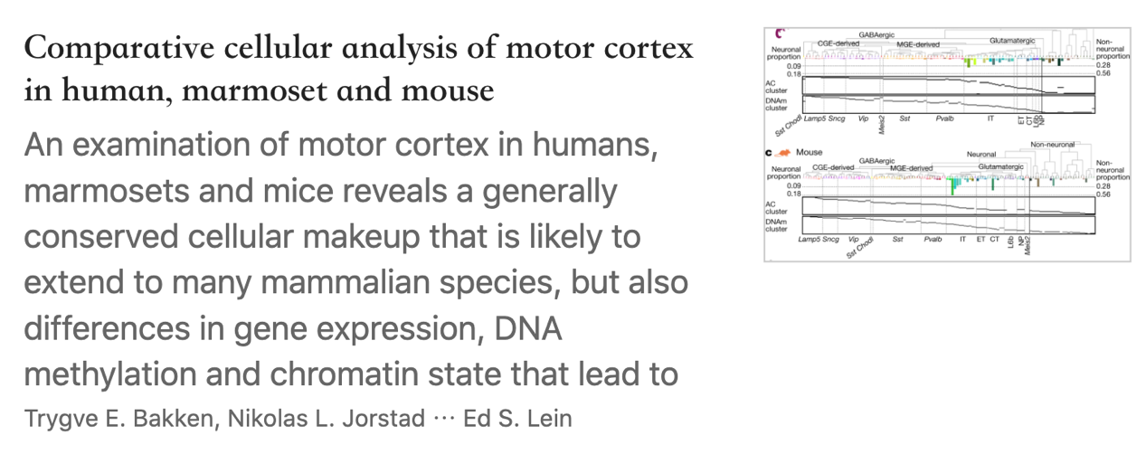 研究三:Comparative cellular analysis of motor cortex in human,marmoset and mouse。该研究对小鼠、狨猴以及人类初级运动皮层中共计超过45万个细胞进行了转录组和表观组测序,揭示了不同物种中初级运动皮层中神经元类型之间的保守性,以及各物种之间的独特性。