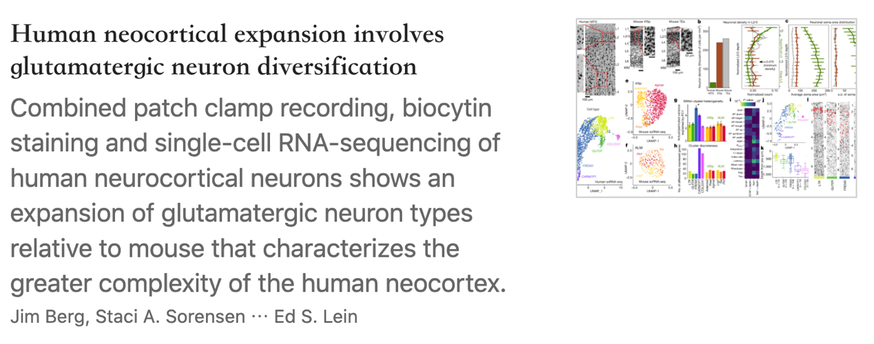 研究四:Human neocortical expansion involves glutamatergic neuron diversification。利用膜片钳技术、biocytin染色和单细胞测序构成的平台Patch-Seq检测了人的新皮层,展示了五种谷氨酸能神经元在形态、生理、基因表达上的吻合性,揭示了皮层中神经元种类的丰富性。