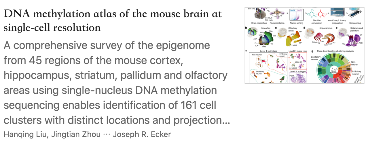 研究五:DNA methylation atlas of the mouse brain at single-cell resolution。对小鼠皮层、海马、纹状体、苍白球、嗅觉区上45个区域共计103,982个细胞进行了DNA甲基化测序,构建了不同脑区神经元甲基化图谱与网络,同时将甲基化组与染色质可及性组数据结合,描绘了小鼠大脑神经元多样性与空间组织的表观基础。