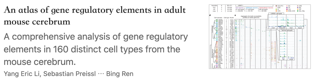 研究六:An atlas of gene regulatory elements in adult mouse cerebrum。研究了成年小鼠同形皮层、嗅球、海马以及脑核区45个区域共计超过80万个细胞的染色质可及性,构建出了超过160个不同细胞类型的顺式作用元件调控图谱。