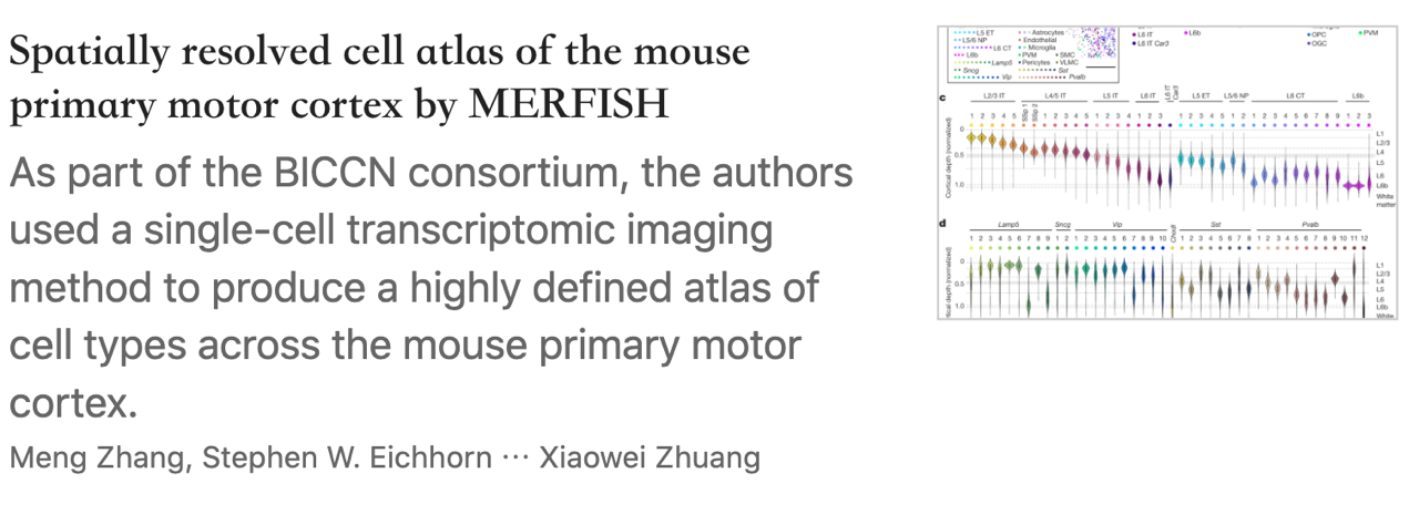 研究七:Spatially resolved cell atlas of the mouse primary motor cortex by MERFISH。利用MERFISH,剖析了小鼠初级运动皮层以及邻近区域共计约30万个细胞,确定了95个神经元/非神经元细胞群,描绘了初级运动皮层复杂的空间网络。