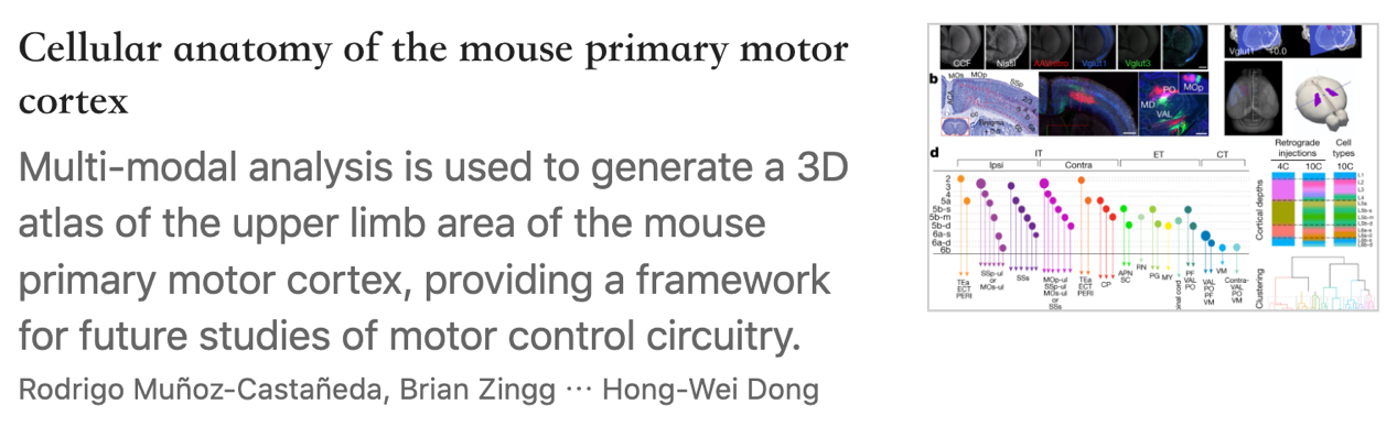 研究八:Cellular anatomy of the mouse primary motor cortex。利用基因标记、测序、全脑成像等技术,构建了小鼠primary motor cortex,upper limb area(MOp-ul)的3D结构图谱,在该区域定义了24个投射神经元类型,并绘制了输入-输出神经元网络。