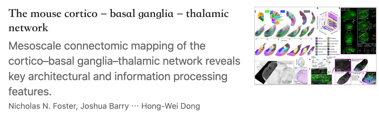 研究九:The mouse cortico–basal ganglia–thalamic network。鉴定了六个并行的皮质-基底核-丘脑网络。